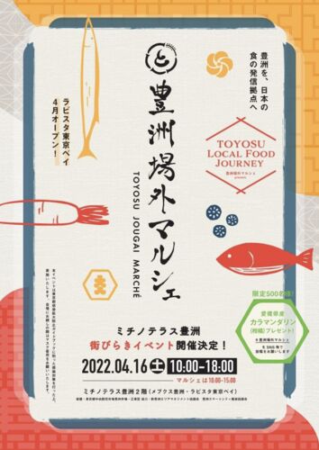 江東区豊洲のミチノテラス豊洲で2022年4月16日の日中に街開きイベントが開催される。詳細は末尾リンクから。(2022/04/12)。 清水建設 イベント概要 会場マップ タイムテーブル 豊洲場外マルシェ ミニクルーズ 自動運転車体験 その他 参考:「ミチノ…