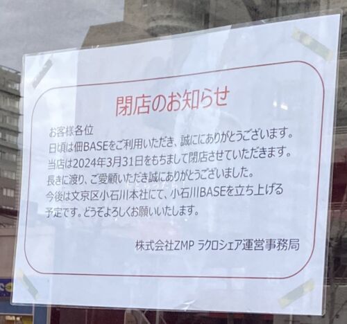 自動運転サービスを手掛けるZMPが低速自動運転の一人乗りロボ「ラクロ」などを展示していたショールーム「ZMP佃BASE」(中央区佃)を2024年3月31日にクローズした。(2024/04/09)。 どらったら!撮影 閉店告知概要 参考 一人乗り自動運転…