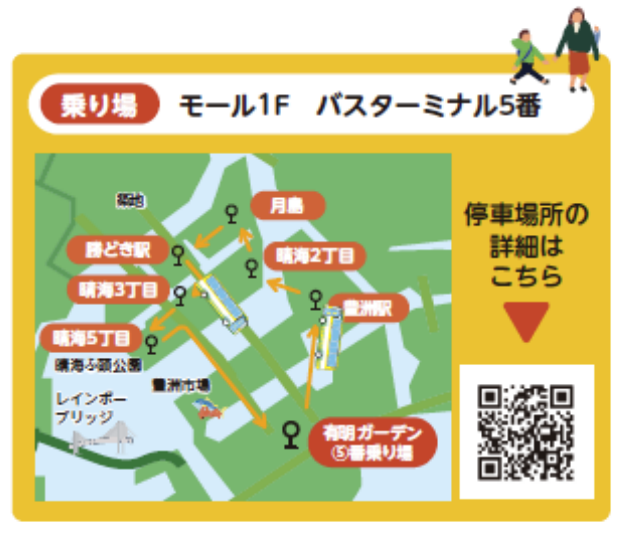 有明ガーデン5番乗り場(10分)豊洲駅(6分)晴海2(7分)月島駅(5分)勝どき駅(3分)晴海3丁目(4分)晴海5丁目(17分)有明ガーデン